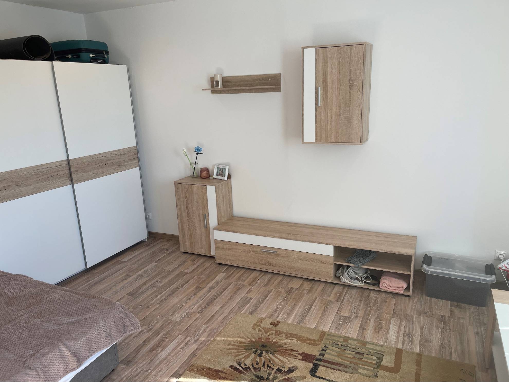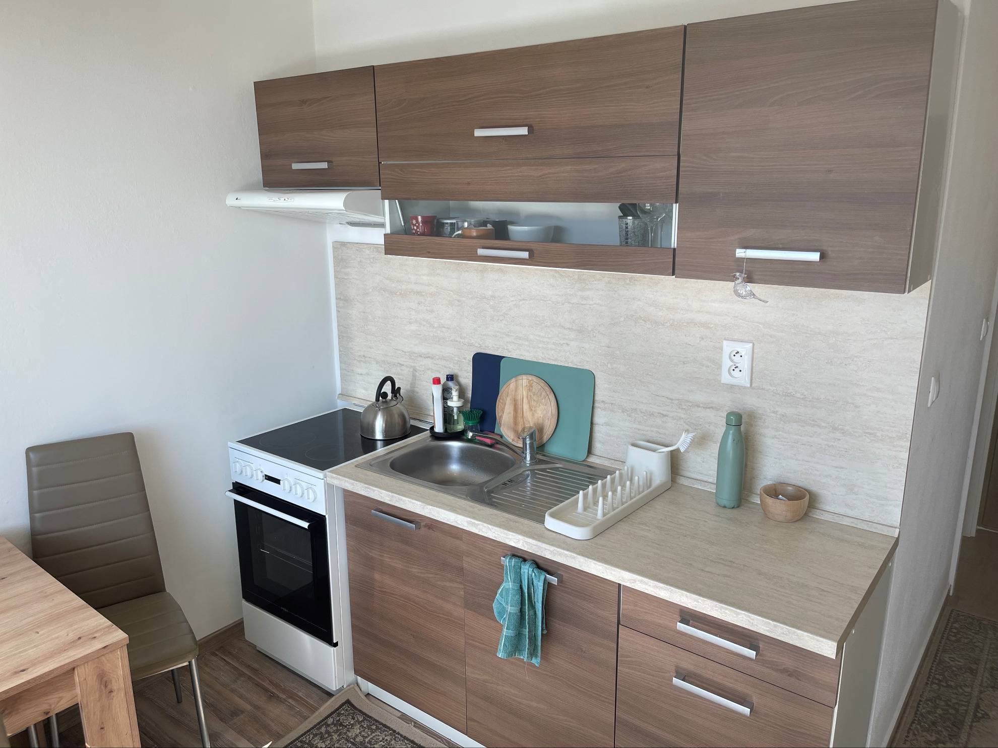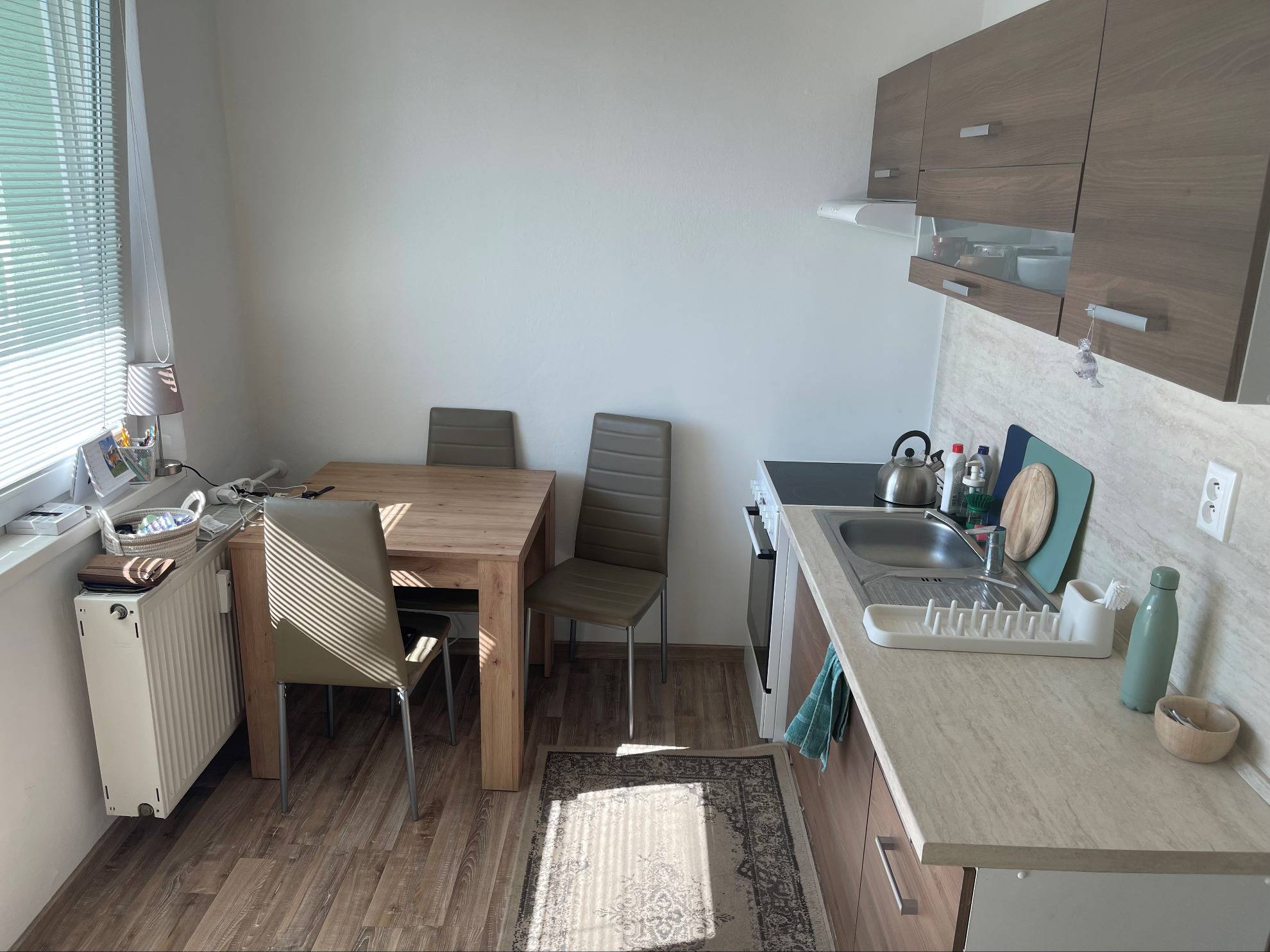 Dispozične pozostáva zo vstupnej chodby, kuchyne s výstupom na veľký balkón, priestrannej izby, kúpeľne s vaňou a toalety.