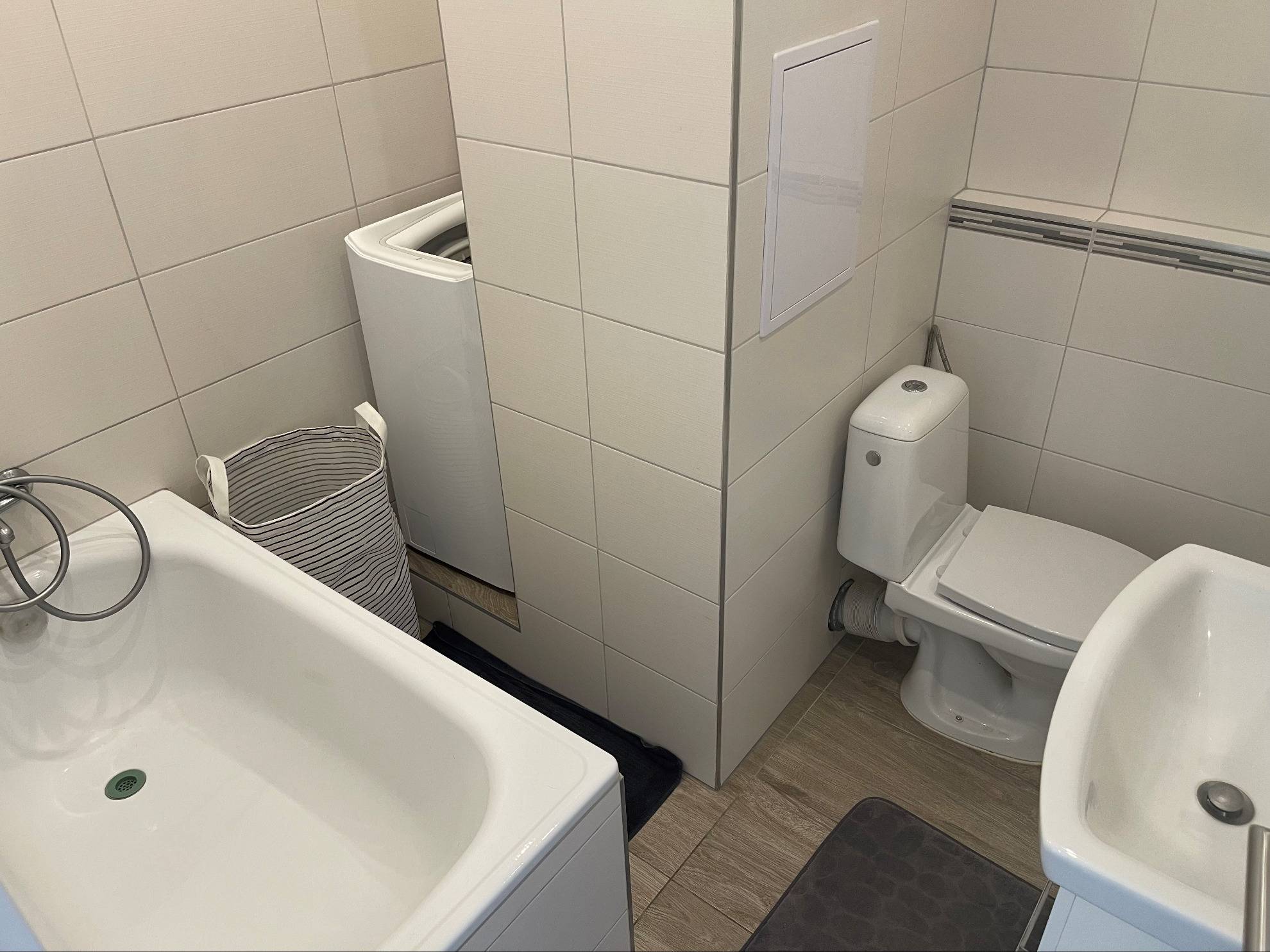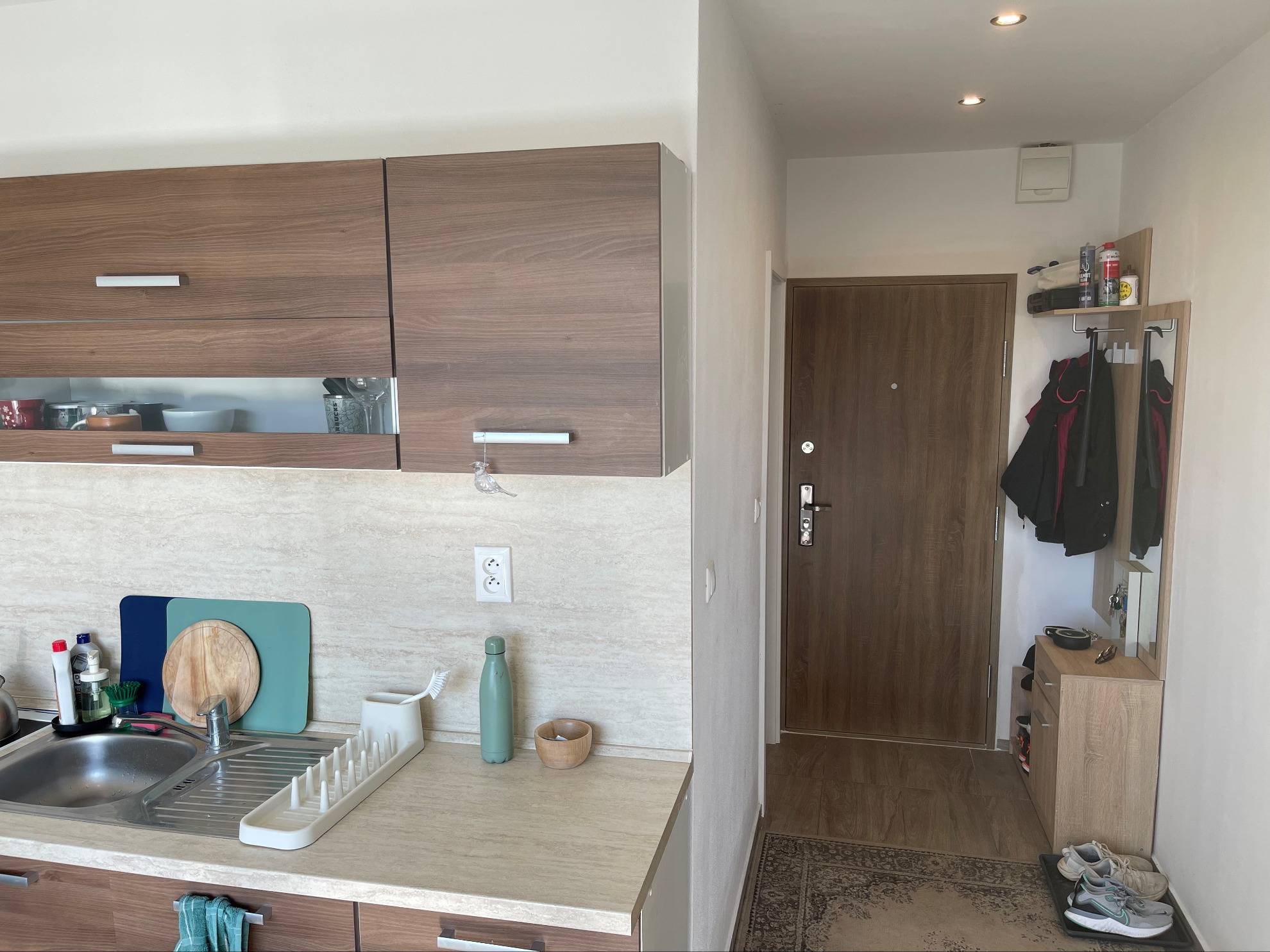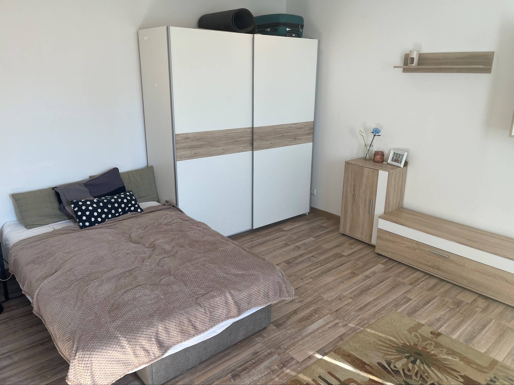 Dispozične pozostáva zo vstupnej chodby, kuchyne s výstupom na veľký balkón, priestrannej izby, kúpeľne s vaňou a toalety.
