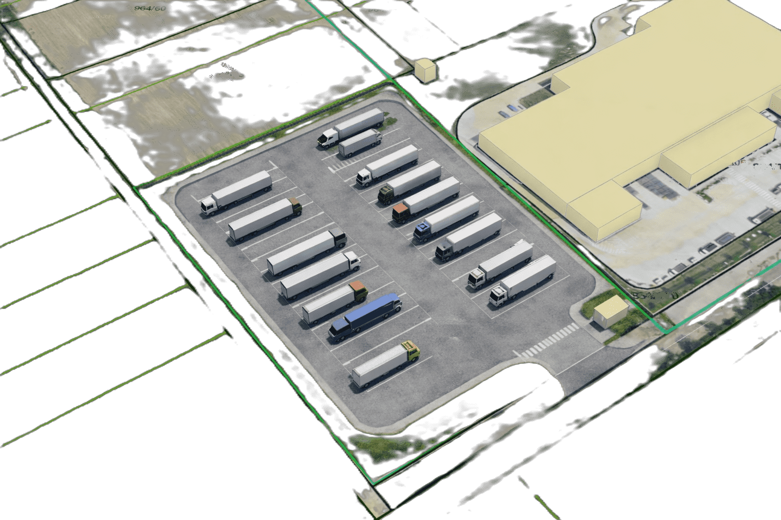 Súčasťou prezentácie je aj ilustračná fotografia, ktorá slúži ako predstava možného budúceho využitia (napr. vybudovanie spevnených plôch pre parkovanie kamiónov alebo skladový areál).
