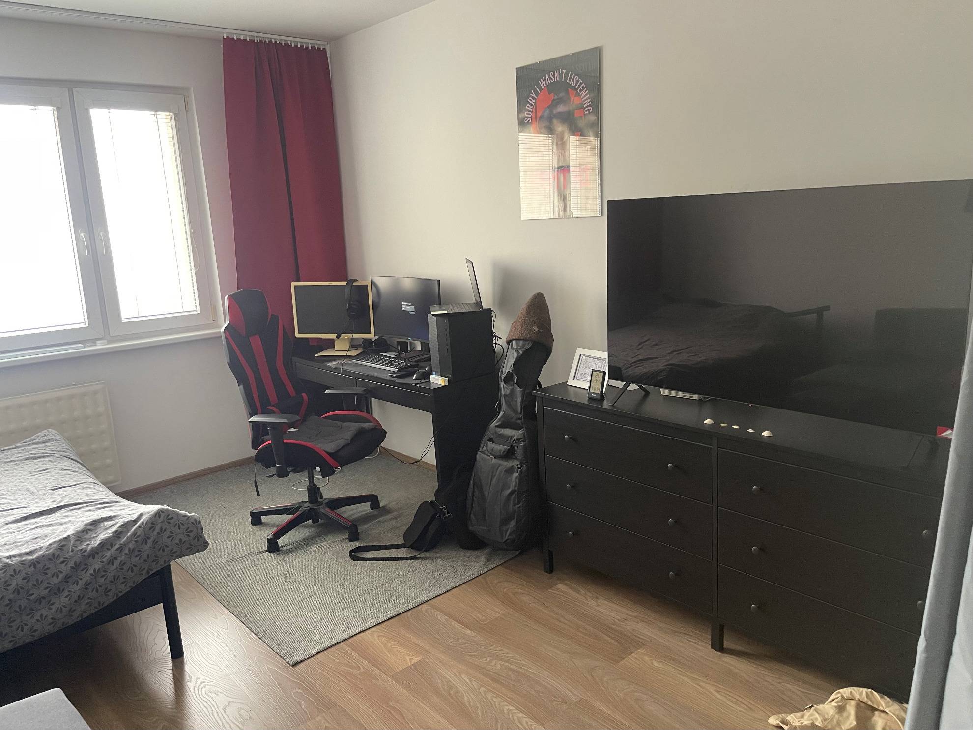 Dispozične pozostáva zo vstupnej chodby, kuchyne s výstupom na veľký balkón, priestrannej izby, kúpeľne s vaňou a samostatnej toalety.